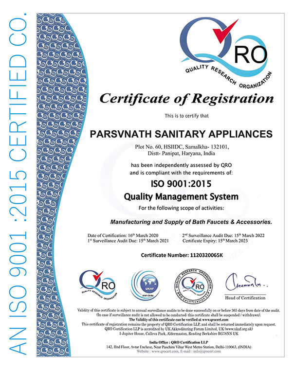 Commitment with Quality, Because of that effort, PARSHA has obtained the certification of its management system for quality and environment. This system complies with the guidelines of ISO 9001 (in the scope of conception, development, production, commercialization of ceramic sanitaryware, bathtubs and showertrays in acrylics and composites, washbasins in composites, whirlpool baths and shower columns, shower enclosures, kitchen sinks and bath furniture. Conception, development and commercialization of bathroom faucets series, single lever diverters, showers, kitchen faucets, bathroom sets and accessories.